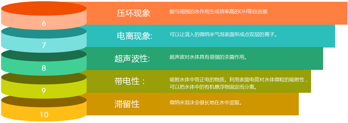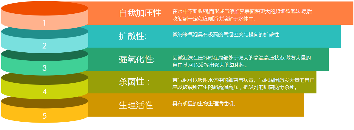 ◆由于納米氣泡不同于普通氣泡的特性,在水中形成的氣液界具有容易接受H+和OH-,而使界面常帶有負電荷,其較高的溶解氧,良好的氣浮效果和強氧化性在水處理應用中具有占地小,操作簡便,投資小,無污染等優勢。