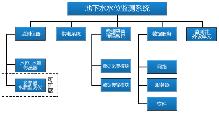 系統組成:系統由供電單元,數據采集傳輸單元、投入式水質傳感器、地下水監測信息管理平臺組成。